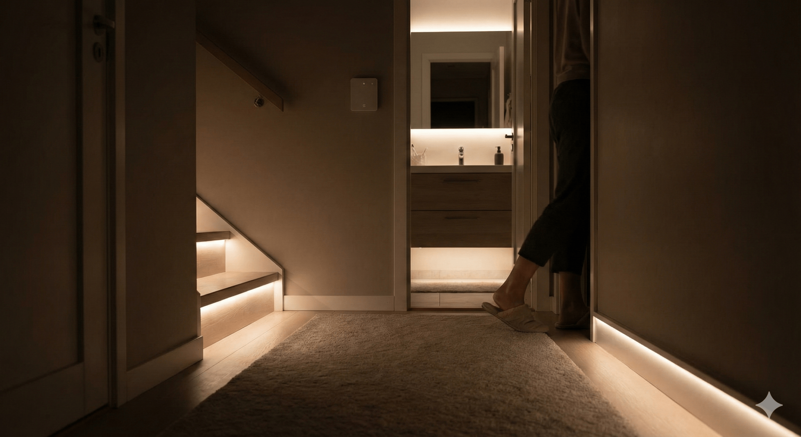 W systemie Grenton oświetlenie nocne przestaje być tylko gadżetem, a staje się elementem tzw. logiki obecności. Zamiast gwałtownego rozbłysku, system wie, że jest noc, rozpoznaje Twój ruch i delikatnie rozświetla drogę, dbając o to, byś po powrocie do łóżka zasnął w mgnieniu oka.